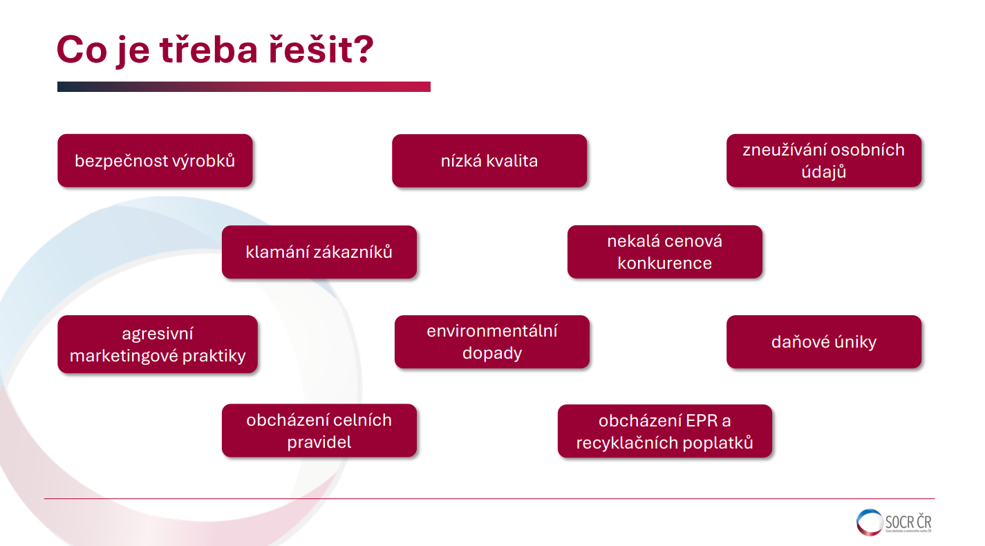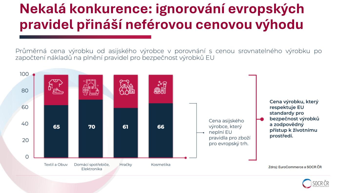 Dodržování unijních bezpečnostních nebo ekologických standardů („compliance“) něco stojí. Pro evropské firmy se jedná o 30 až 40 procent koncové ceny. Platformy ze třetích zemí tyto poplatky neplatí, což jim dává jasnou konkurenční výhodu. Často se vyhýbají i daním nebo clům, kdy například objednávku rozdělí do více zásilek nebo cenu balíku podhodnotí, aby se „vešly“ do zmíněného limitu 150 euro.