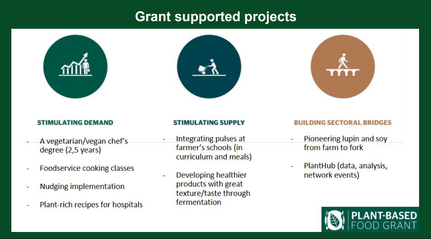 „Jedním z cílů těchto grantů je stimulace poptávky. Od farmářů často slýcháme, že jsou ochotní vyprodukovat to, co si budou spotřebitelé žádat. Takže jsme přemýšleli, jak poptávku po produktech jako fazole, čočka, zelenina nebo obilniny zvýšit,“ popsala Johansen. Tento program tak proplácí třeba různé kuchařské kurzy nebo několikaleté studium zaměřené na rostlinnou stravu, pomáhá také měnit stravovací standarty v nemocnicích.