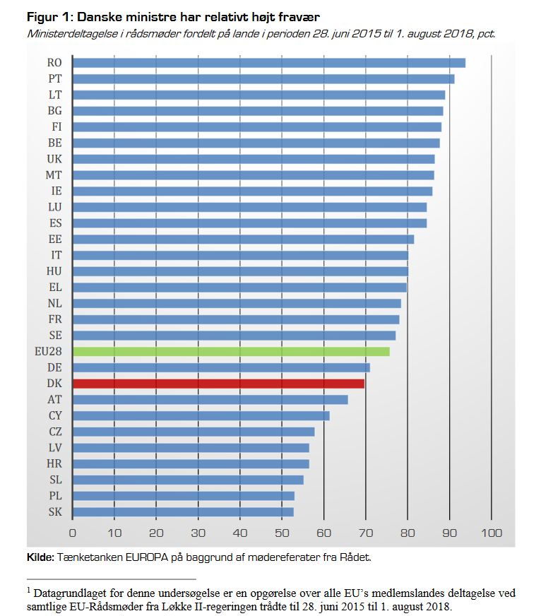 Ministerská účast na Radách EU (červen 2015 – srpen 2018). Zdroj: DANSKE MINISTRE HAR STØRRE FRAVÆR END DERES EU-KOLLEGER http://thinkeuropa.dk