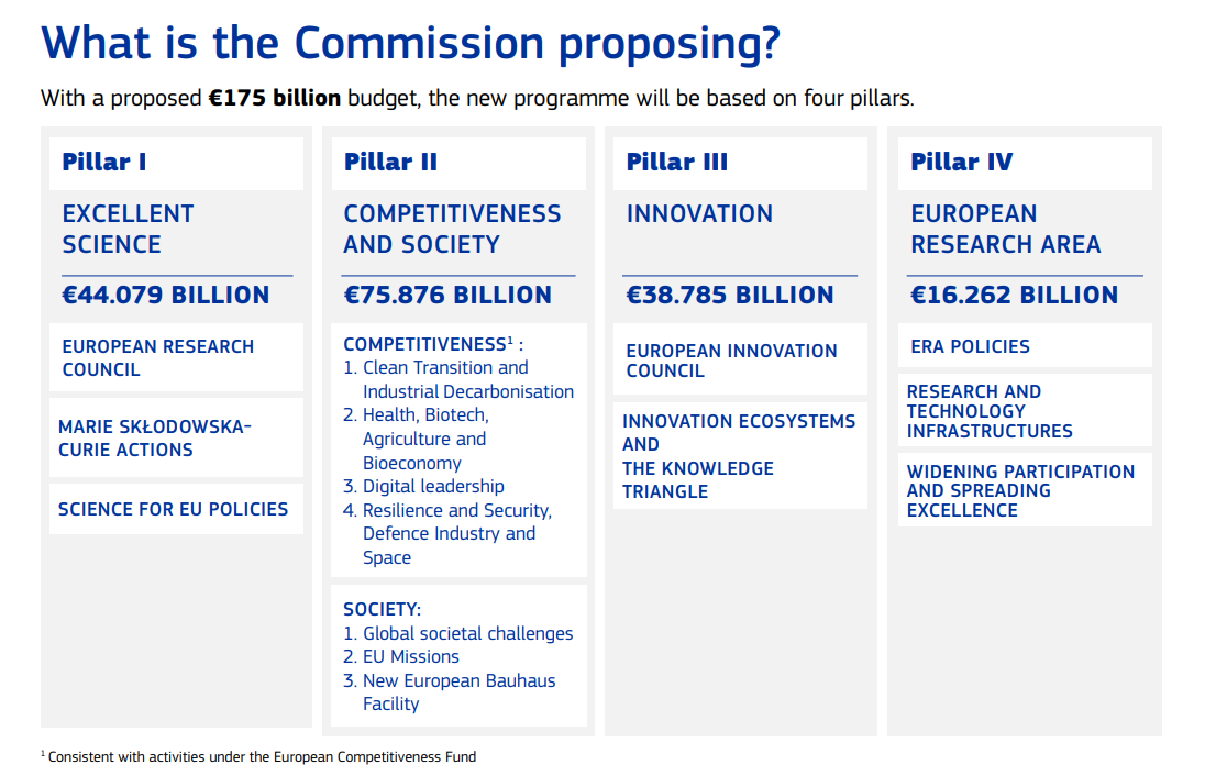 Evropská komise v létě představila svůj návrh dlouhodobého rozpočtu EU na roky 2028 až 2034, který se nese ve znamení boje za konkurenceschopnost a zjednodušování. Poznat je to například v počtu různých fondů či nástrojů financování – zatímco nyní jich existuje více než 50, nově jich má být „pouze“ 16. Centrem všeho se má stát nový Evropský fond konkurenceschopnosti (ECF), či jednoduše Fond konkurenceschopnosti. Vědci a inovátoři napříč EU zřejmě ocení, že jejich podpory se změny tolik nedotknou. „Horizont je navržený jako samostatný program se silným, téměř dvojnásobným rozpočtem než dosud,“ poznamenal na konferenci Francisco de la Torre Francia z Evropské komise. Unijní exekutiva tentokrát navrhuje objem programu na 175 miliard euro. Struktura zůstává velice podobná, tentokrát půjde o čtyři pilíře. Hlavně ve druhém pilíři se projevuje úzké propojení s Fondem konkurenceschopnosti, sdílejí totiž stejné oblasti, které z nich lze podpořit. Jedná se o „Čistou tranzici a průmyslovou dekarbonizaci“, „Zdraví, biotechnologie, zemědělství a bioekonomiku“, „Digitální leadership“ a „Odolnost a bezpečnost, obranný průmysl a vesmír“.