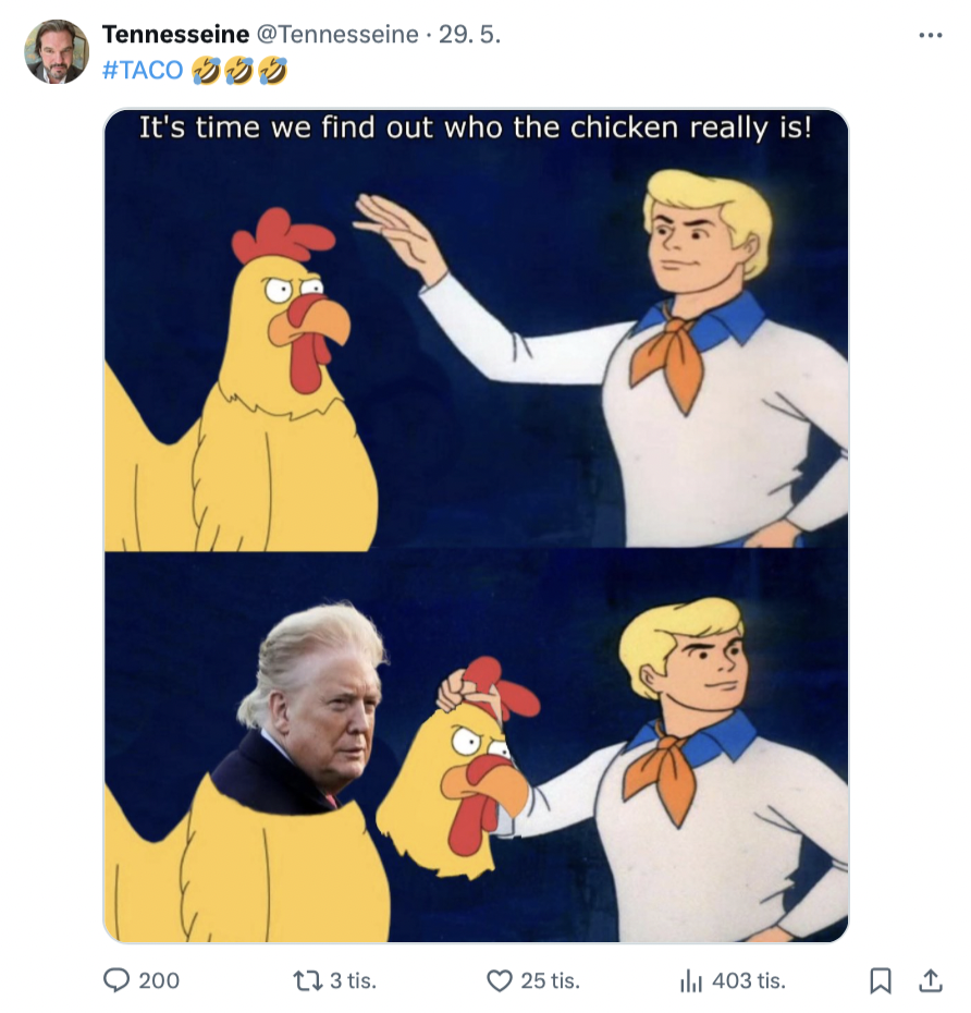 Jak jsme v minulých vydáních newsletteru předvídali, je to tady zase. Americká politika je opět středobodem internetových vtípků. Jednak končí velká politická romance mezi Trumpem a Muskem, jednak Trump zase přišel s oznámením cel, které následně odložil. Dal tak za pravdu grotesknímu označení jeho politiky „TACO“, se kterým přišel sloupkař Financial Times Robert Armstrong, a pod kterým se schovává věta „Trump always chickens out.“ (v překladu něco jako „Trump vždycky vysrabí.“). Nutno ale podotknout, že než Trump tentokrát „vysrabil“, Evropě úsměv zamrzl. Trump si totiž minulý týden na své sociální síti Truth Social postěžoval, že jednání s Evropskou unií nikam nevedou, a tak doporučí, aby od 1. června platily 50% cla na dovoz z EU. Aby po nedělním telefonátu se šéfkou Evropské komise Ursulou von der Leyen, který mimochodem označil za „krásný“, oznámil, že cla odsune na 9. července. Mezitím se v USA vede o Trumpova „reciproční“ cla bitva – Federální obchodní soud v New Yorku je ve středu pozastavil, Odvolací soud ve Washingtonu je ale obratem obnovil. Ještěže už bude víkend!