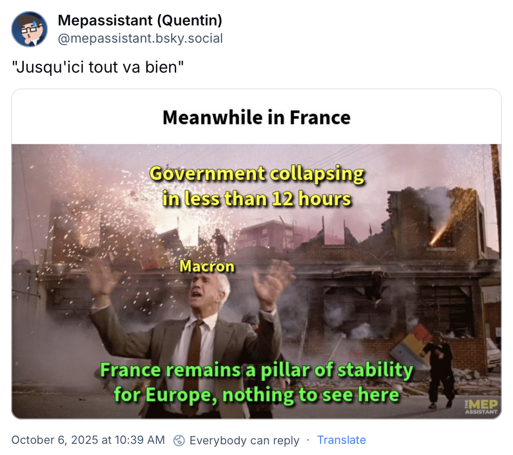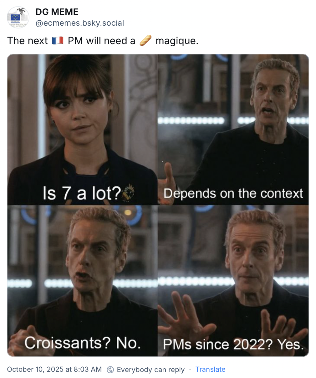Francouzská politická krize na půdě EU. Francie se zmítá v politické krizi, prezident Emmanuel Macron hledá už osmého premiéra. Ten poslední rezignoval po 27 dnech, jen několik hodin poté, co představil svůj kabinet. Dění ve Francii neuniklo pozornosti meme tvůrců: