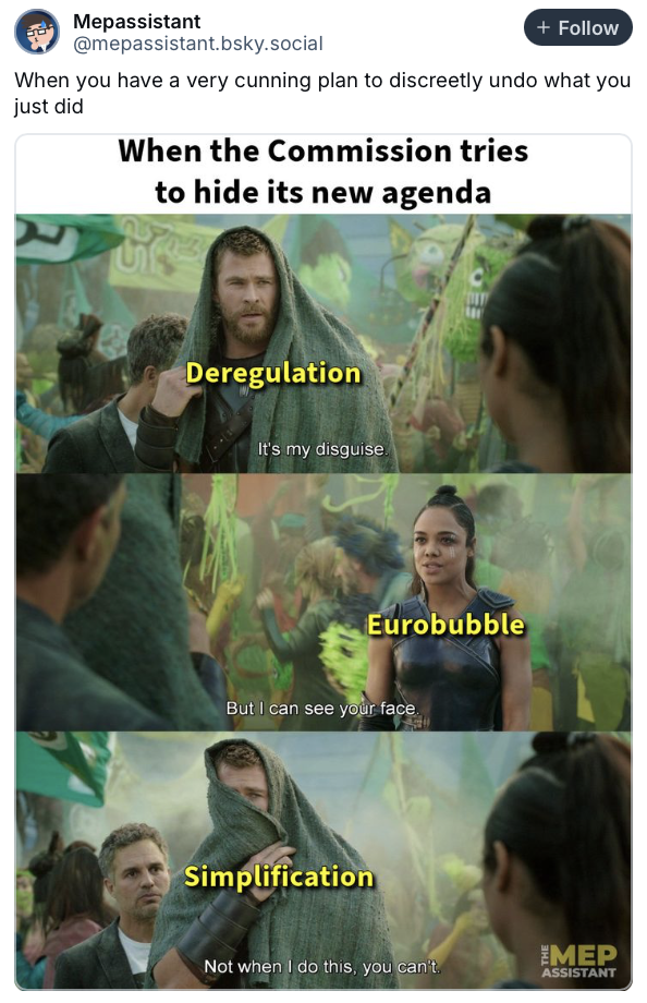 It’s the EU jargon, stupid. Evropská komise po silném volání po záchraně evropské konkurenceschopnosti, deregulaci a debyrokratizaci z různých stran zájmových aktérů v posledních týdnech vydává jako na běžícím páse tzv. omnibusy – tedy zjednodušení stávajících politik. Někdy je ale až úsměvné, jak se snaží balancovat mezi vejci a opatrně volí slova, aby si to nerozházela ani se zastánci tvrdého osekání evropské legislativy a oslabení některých (čti zelených) politik, a ani s těmi, kteří by to s deregulací zase tolik nepřeháněli. Proto teď tak často slyšíme, že EU „zjednodušuje“, což neuniklo pozornosti ani MEP Assistantovi – satirickému účtu o evropské politice.I my jsme si vyslechli, že EU „zjednodušuje“, když jsme si volali s německým europoslancem Peterem Liesem. Máme o tom reel a třeba vás taky pobaví.
