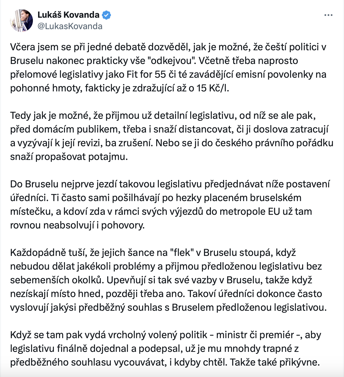 Euroskepticky naladěný český ekonom Lukáš Kovanda se tento týden na síti X pustil do šíření příběhu ze soudku „jedna paní povídala“. Prý už odhalil, proč čeští politici v Bruselu všechno odkývou. Tajnou příčinou má být to, že úředníci, kteří o českých pozicích jednají, si podle něj myslí na teplá pracovní místečka v Bruselu, a aby je dřív nebo později mohli obsadit, veškerou legislativu prostě bez okolků odsouhlasí. Soudek „jedna paní povídala“ je tak možná ještě eufemismus a přiléhavější by bylo označení „úplné sci-fi“.