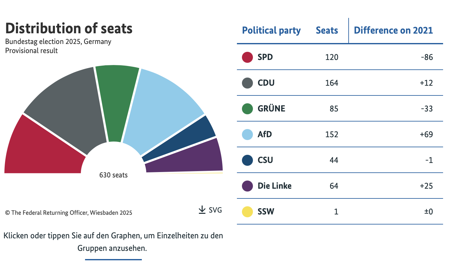 „Výsledek CDU/CSU je zklamáním. Je to i historicky špatný výsledek. Je to ještě asi o čtyři procentní body méně, než nejhorší výsledek bývalé kancléřky za CDU/CSU Angely Merkelové.“A hned na druhém místě, naopak s historicky nejvyšším počtem hlasů (20,8 %), skončila krajně pravicová AfD.
