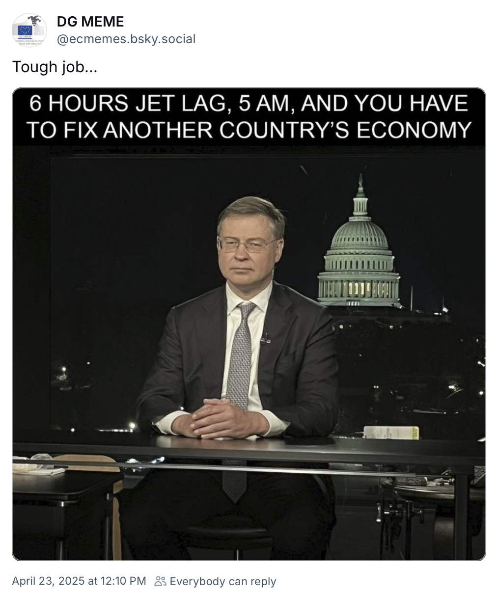 Unijní orloj. Evropští politici a zástupci Evropské unie se v posledních týdnech střídají u americké administrativy jako na orloji, aby zvrátili americká cla namířená proti EU. Po unijním obchodním vyjednavači, eurokomisaři Maroši Šefčovičovi, zavítala do Washingtonu přímo za Trumpem jeho oblíbenkyně, italská premiérka Giorgia Meloni. Dnes by se měl s americkou stranou setkat další eurokomisař – Valdis Dombrovskis. Jak jsme zmiňovali v nedávném podcastu, je to dobře, že se EU snaží jednat skrze všechny dostupné kanály a příležitosti. Například Ursula von der Leyen doufá, že si amerického prezidenta ukradne na slovíčko na okraj papežova pohřbu v Římě v sobotu. Jak vtipně podotklo Politico, ze zkušenosti novinářů se na ty, kteří s vámi nechtějí mluvit, vyplácí číhat před záchodky. A meme studna s vtípky na téma cel mezi USA a EU taky ještě nevyschla:
