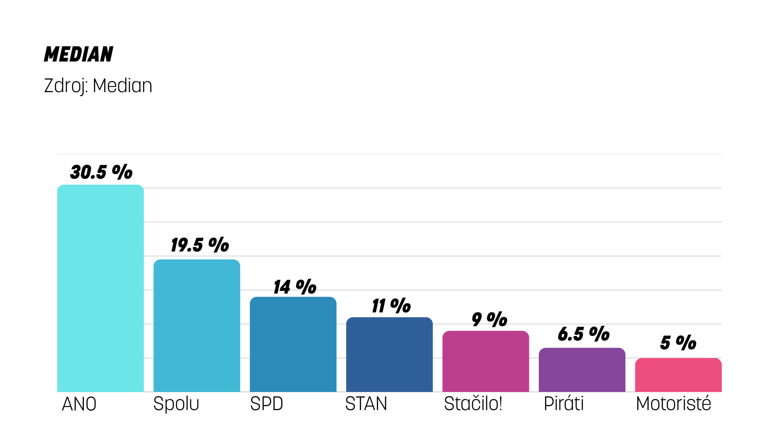 Podle volebního modelu agentury Median zveřejněného v polovině září má největší podporu mezi voliči hnutí ANO (30,5 %).