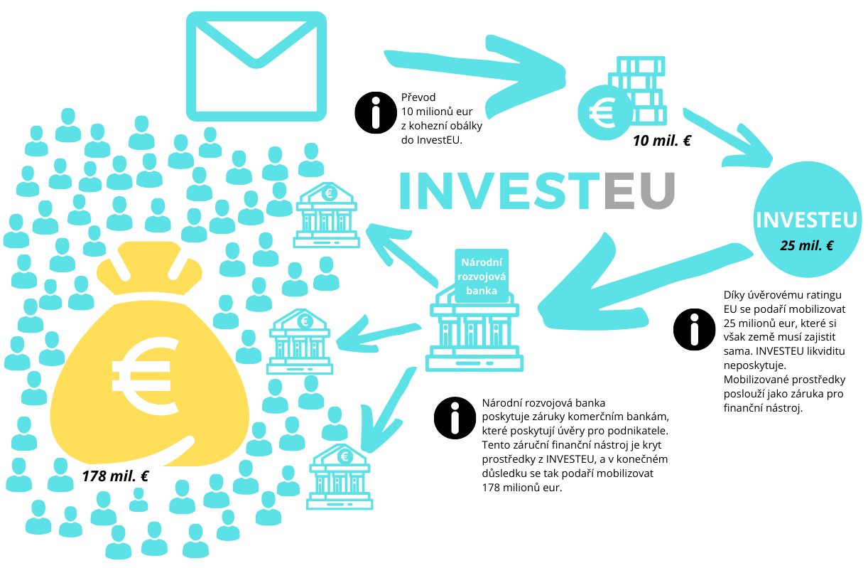Česká republika se do InvestEU aktivně zapojí. Vláda totiž schválila převod prostředků z operačního programu Technologie a inovace pro konkurenceschopnost (nástupce OP Podnikání a inovace pro konkurenceschopnost) do složky členského státu InvestEU, a to ve výši 80 milionů eur. Ilustrativní příklad v podobě záruk na druhou přitom nebyl náhodný, protože oněch 80 milionů poslouží jako záruka za záruky pro malé a střední podniky. Bude se jednat o pokračování programu Záruka 2015 až 2023 realizovaného prostřednictvím Národní rozvojové banky (donedávna Českomoravská záruční a rozvojová banka), který bude mimochodem opět financován tak trochu z evropských peněz, konkrétně z prostředků navrácených do finančních nástrojů operačních programů Podnikání a inovace (2007-2013) a Podnikání a inovace pro konkurenceschopnost (2014-2020). Národní rozvojová banka se zaručí za úvěry pro malé a střední podniky, které jim poskytnou další banky. A za tuto záruku za úvěry se zaručí Evropská unie prostřednictvím svého fondu InvestEU.