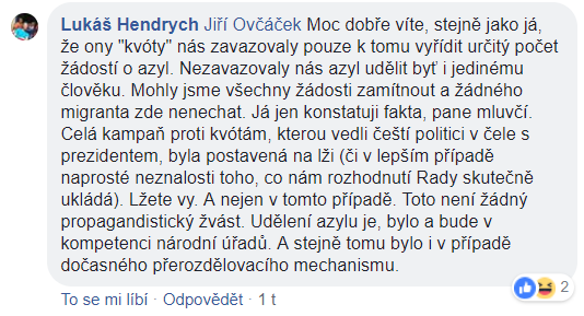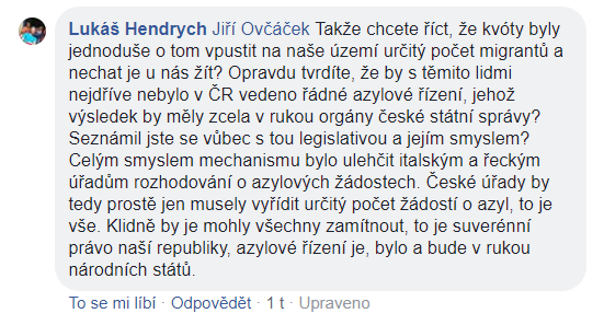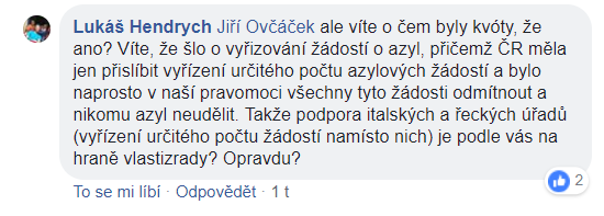 Není ale fér dávat tuto neznalost za vinu jen Jiřímu Ovčáčkovi. Celá diskuze o migrační politice je v českém prostředí velmi, ale opravdu velmi pokřivená a zkreslená. Důkazem je i nedávná anketa Aktuálně.cz, podle které na otázku ohledně podstaty kvót zcela správně odpověděli pouze čtyři členové sněmovního výboru pro evropské záležitosti. A to je teprve tristní. Že poslanci hnutí SPD neměli o skutečné podstatě kvót ani páru (byť na nich prakticky postavili svou volební kampaň, stejně jako Miloš Zeman), snad už ani nikoho nepřekvapí.