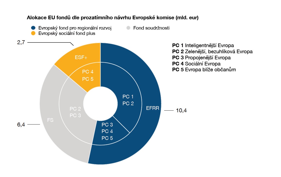 České republice bylo z evropského rozpočtu na kohezní politiku pro roky 2021 až 2027 přislíbeno přibližně 20 miliard eur. Ty budou čerpány především z třech fondů, kterými jsou Evropský fond pro regionální rozvoj (10,4 miliardy eur) Fond soudržnosti (6,4 miliardy eur) a Evropský sociální fond plus (2,7 miliardy eur). Co všechno si může Česko za tyto peníze pořídit? Z Evropského fondu pro regionální rozvoj jsou financovány aktivity spadající do všech pěti politických cílů, a tak je jejich výčet opravdu široký. Zejména se jedná o výzkum, vývoj, inovace, podnikání, digitalizace, školství, zdravotnictví, památky, silnice II. a III. třídy, městská hromadná doprava nebo integrovaný záchranný systém. Z Fondu soudržnosti jsou pak stavěny dálnice, železnice a financovány projekty v oblasti obnovitelných zdrojů a životního prostředí. Prostředky posledního z uvedené trojice, Evropského sociálního fondu plus, zase směřují na vzdělávací programy, rekvalifikace, sociální začleňování a také na podporu postižených a znevýhodněných osob. Z tohoto pohledu se zdá, že možností k financování je nespočet.Vláda chce přesměrovat část peněz ze sociálního fondu do infrastruktury, organizace se bouříV případě Evropského fondu pro regionální rozvoj, který má největší rozpočet a pokrývá aktivity spadající do všech politických cílů, je však procentuální mírou tematické koncentrace stanoveno, že 70 % jeho prostředků musí být využito k naplňování prvních dvou politických cílů. Přičteme-li k tomu, že z Fondu soudržnosti, který je z českého pohledu co do rozpočtu druhý největší, je financována především infrastruktura a environmentální projekty, bude výrazná většina investic směřovat do cílů Inteligentnější Evropa a Zelenější, bezuhlíková Evropa i v České republice. V centru dění tak budou digitalizace, inovace, malé a střední podniky, transformace ekonomiky, obnovitelné zdroje a boj proti změně klimatu. Co je však zapotřebí dodat, je řada dalších pravidel, která podmínky tematické koncentrace zpřísňuje či naopak rozvolňuje. Příkladem může být možnost za určitých podmínek prostředky mezi jednotlivými fondy převádět. V případě České republiky to má být až 25 %.