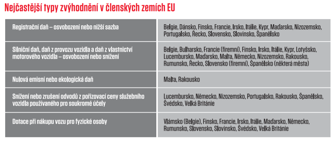 Vlastníci elektromobilů se v mnoha zemích Evropské unie těší především daňovému zvýhodnění. V patnácti členských státech včetně Belgie, Finska, Slovenska nebo Španělska majitelé ušetří už při registraci vozidla, v některých z nich je registrační daň pro elektromobily zrušena úplně (např. Řecko, Maďarsko, Portugalsko). Snížení nebo zrušení poplatku pro nízkoemisní vozidla platí v některých zemích také v případech pravidelně placených daní – silniční daně, daně z provozu vozidla nebo daně z vlastnictví motorového vozidla. Například v Nizozemsku patří investice do elektromobilů a plug-in hybridů mezi položky, které si mohou firmy odečíst z daní, v Lotyšsku se pak za každoroční technickou prohlídku elektromobilů platí nejnižší možný poplatek. V řadě zemí jako Švédsko, Německo, Rakousko nebo Portugalsko jsou sníženy nebo zrušeny odvody z pořizovací ceny služebního vozidla používaného pro soukromé účely.