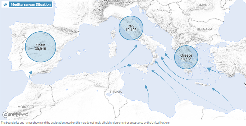 Počty příchozích migrantů od 1. ledna do 20. srpna 2018. Zdroj: UNHCR